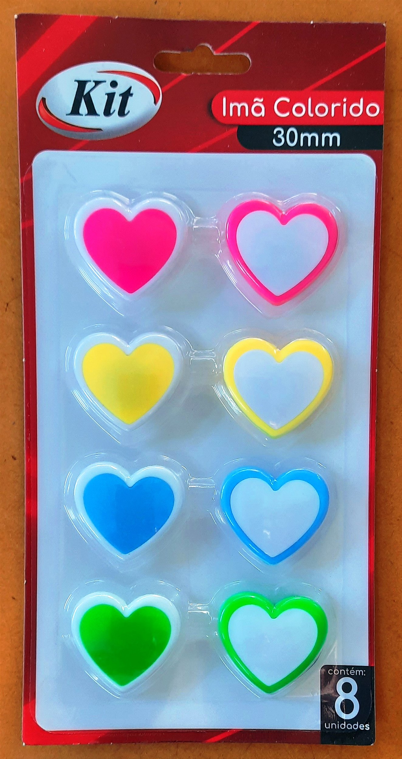 Imã colorido 30mm - coração - Cartela com 8 unidades - Kit