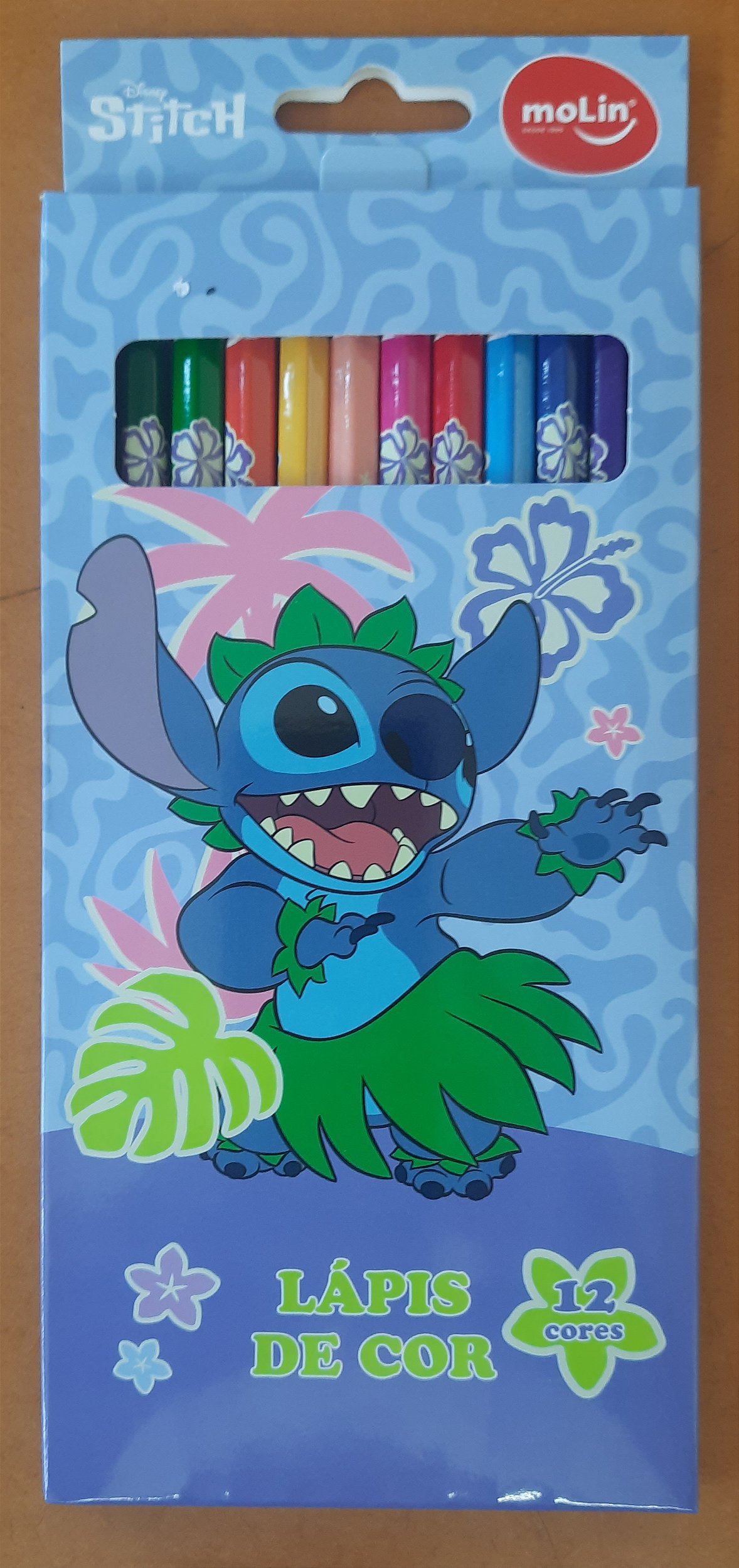 Caixa com 12 lápis de cor de madeira e decorados com Stitch - Molin